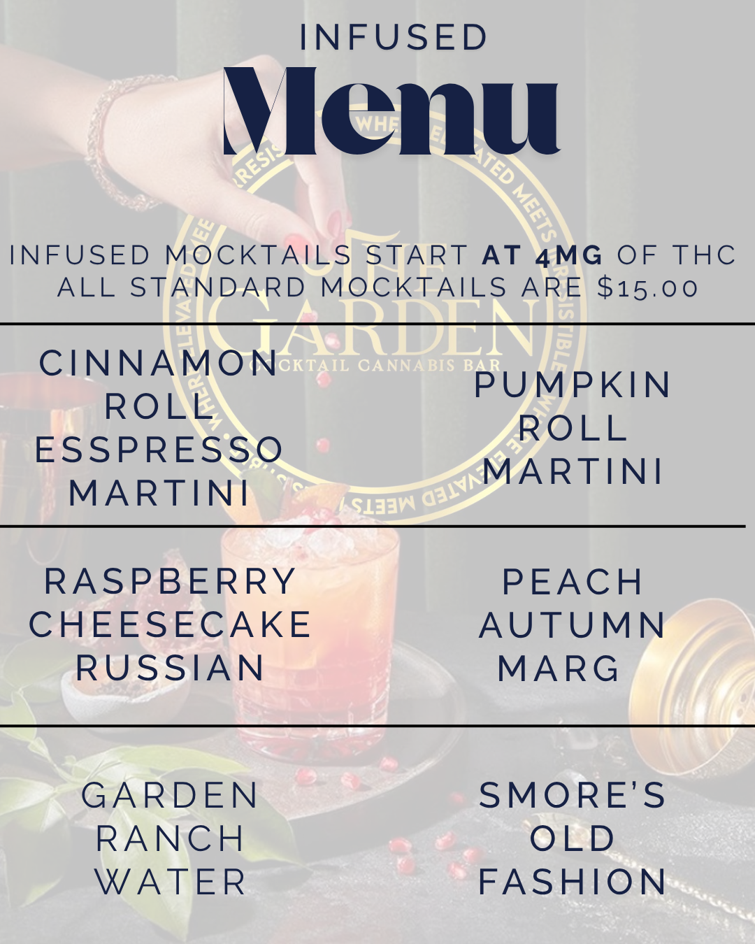 Responsible service: Trained staff guide dosing, suggest pairings, and prioritize a safe, informed experience. Non-infused options and clear labeling are available for all menu items.